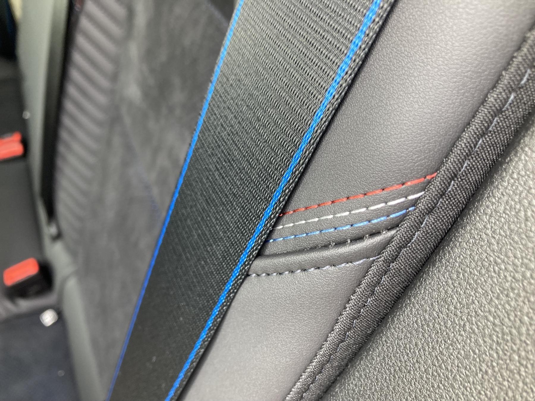 - Lenkrad aus Alcantara/TEP mit Nähten in Blau